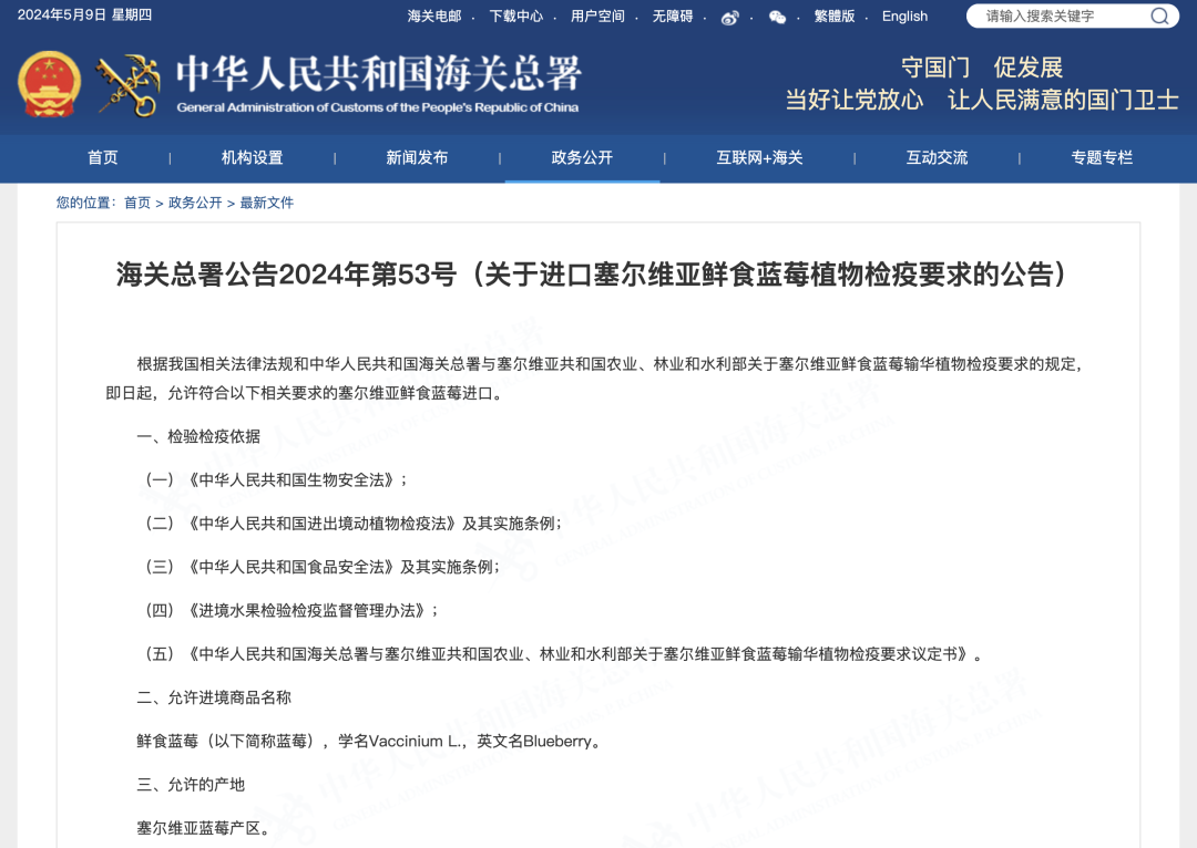 5月8日,海关总署发布关于进口塞尔维亚鲜食蓝莓植物检疫要求的公告: